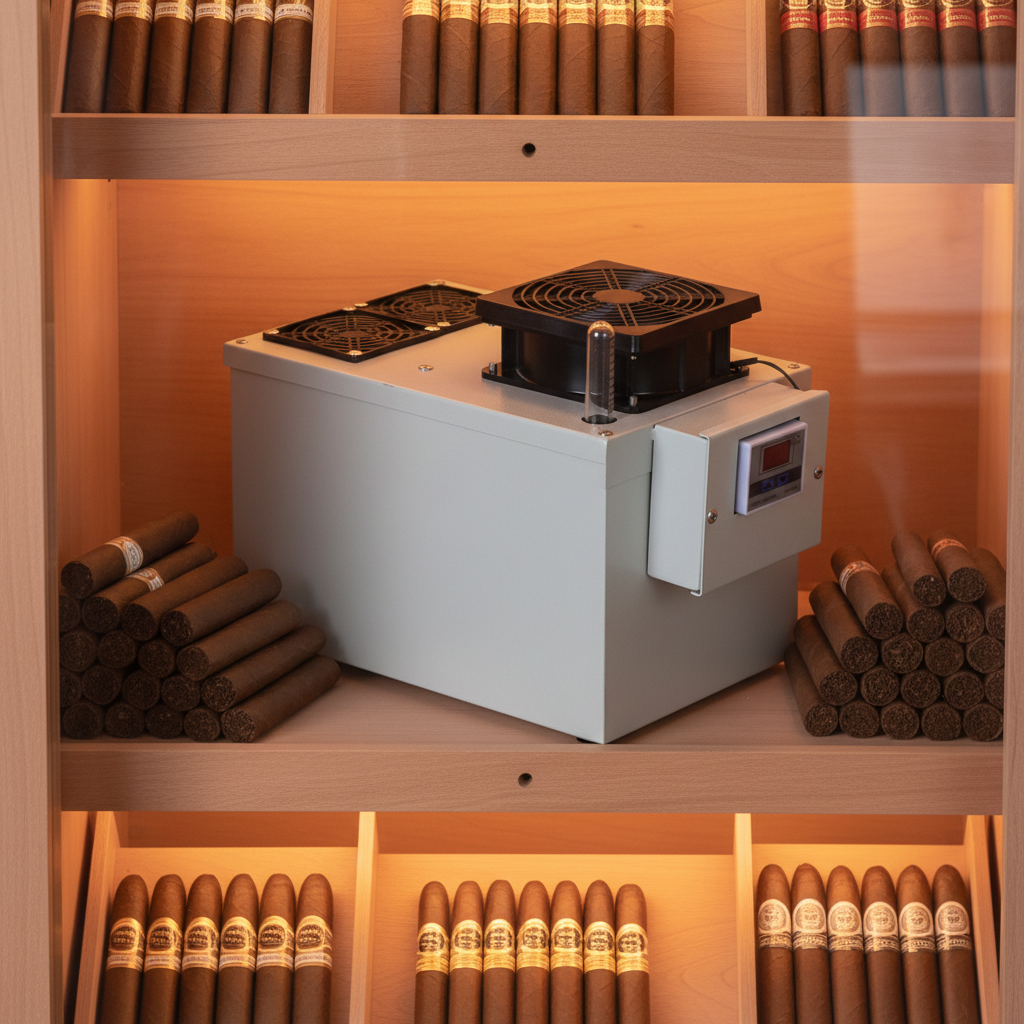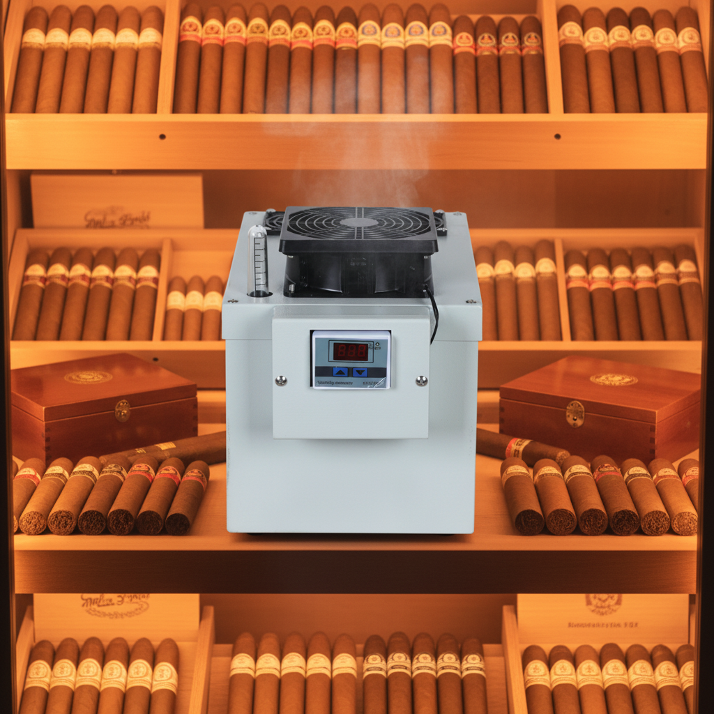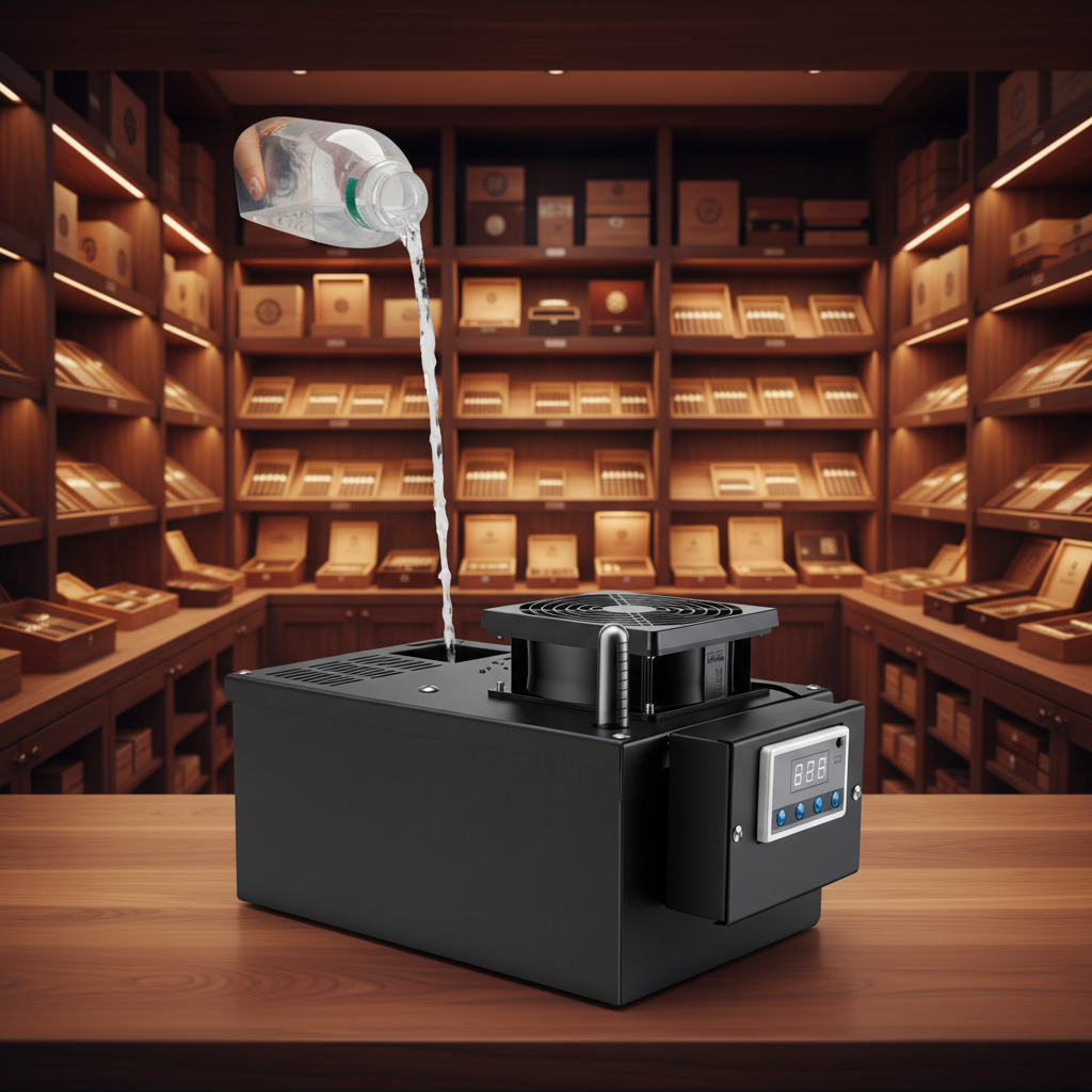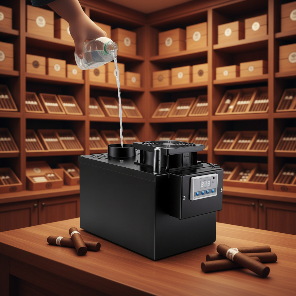 This product is an evaporative humidifier.It mainly soaks the coconut shell cloth material in water,and uses a fan to blow air to promote evaporation,thus humidifying the space of the applicationsite.Since it does not produce mist,it is suitable for use in cigar cabinets,filing cabinets,documentstorage cabinets,and other places where water droplets are not allowed.